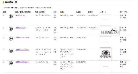 特許情報プラットフォームの検索結果。上2件はgramが登録した商標。3件目はgramによる出願。下2件はシンガポールのThe Tiramisu Hero運営会社による出願